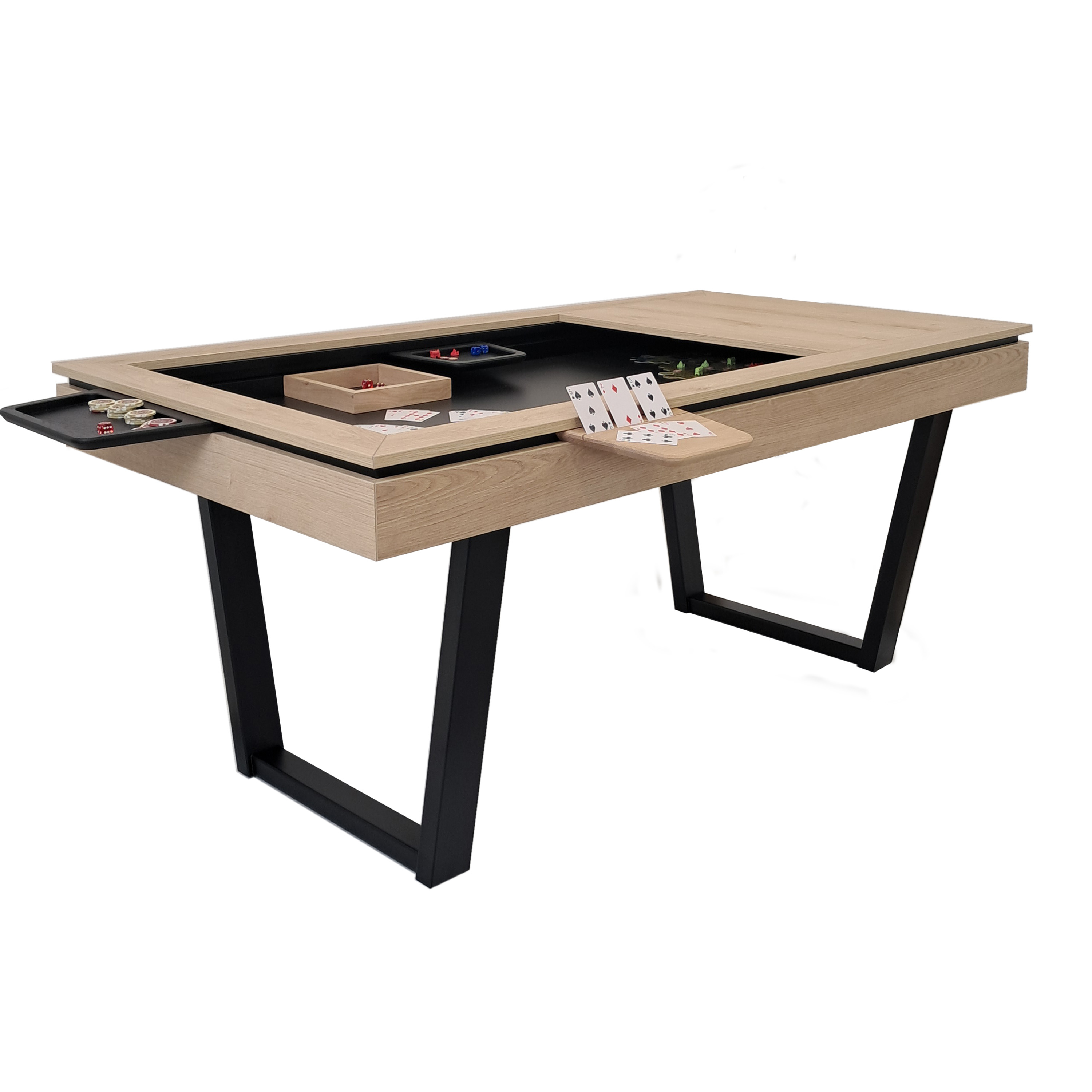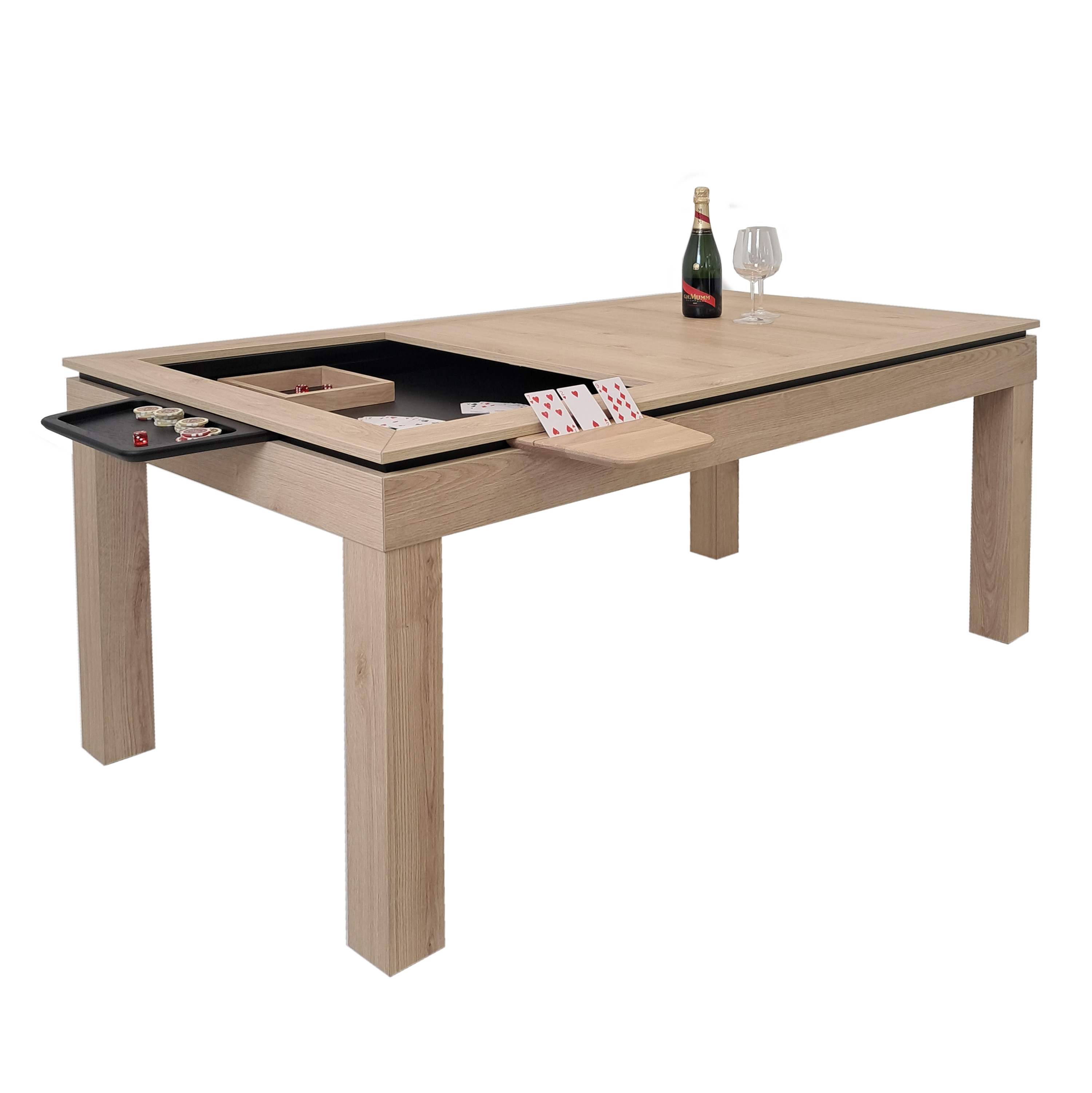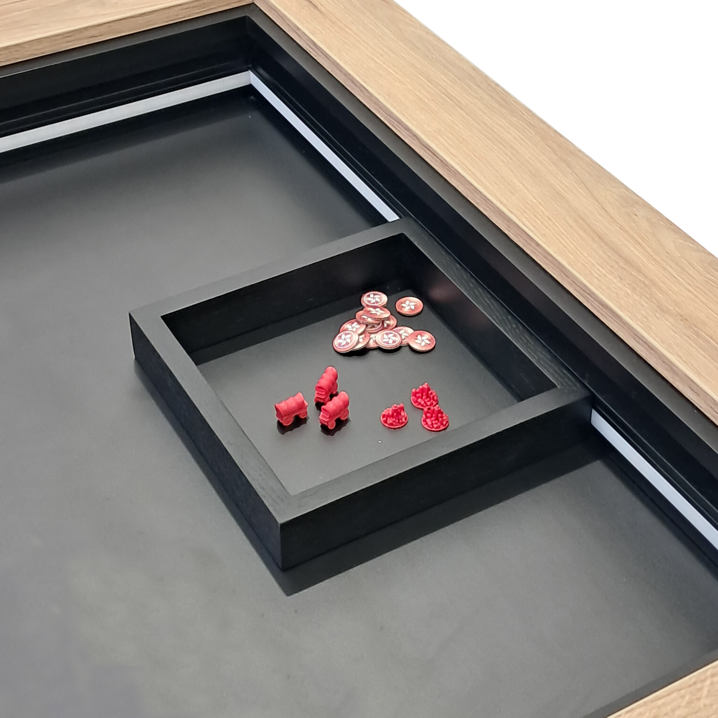 Sous son plateau, la table dissimule un espace intérieur discret, pensé pour accueillir jeux de société, cartes, accessoires ou projets en cours. Cette conception permet de laisser une activité installée tout en retrouvant rapidement une surface de table dégagée, prête à accueillir un repas ou un moment de partage.