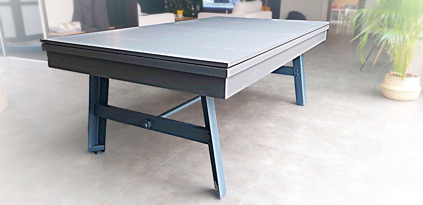 La couleur nano graphite mat — passe-partout — de cette table transformable en billard est très pratique dans cette pièce de vie. Par la simple dépose du plateau ST en trois parties, c'est l'apparition du magnifique jeu américain au tissu vert-bleu posé sur ses pieds laqués finition anthracite F271 qui renforce le caractère animé de la maison.