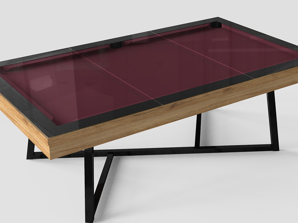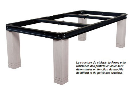 Dans le cas d’un billard transformable en table, ce châssis métallique a un autre avantage : il est moins épais qu’une structure bois, ce qui laisse plus d’espace pour les jambes, sans augmenter la hauteur globale du meuble.