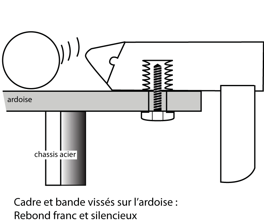 Ces bandes sont parfaitement ajustées et solidement fixées sur les cadres de bande grâce à des systèmes de fixation brevetés, propres à Eurobillards.