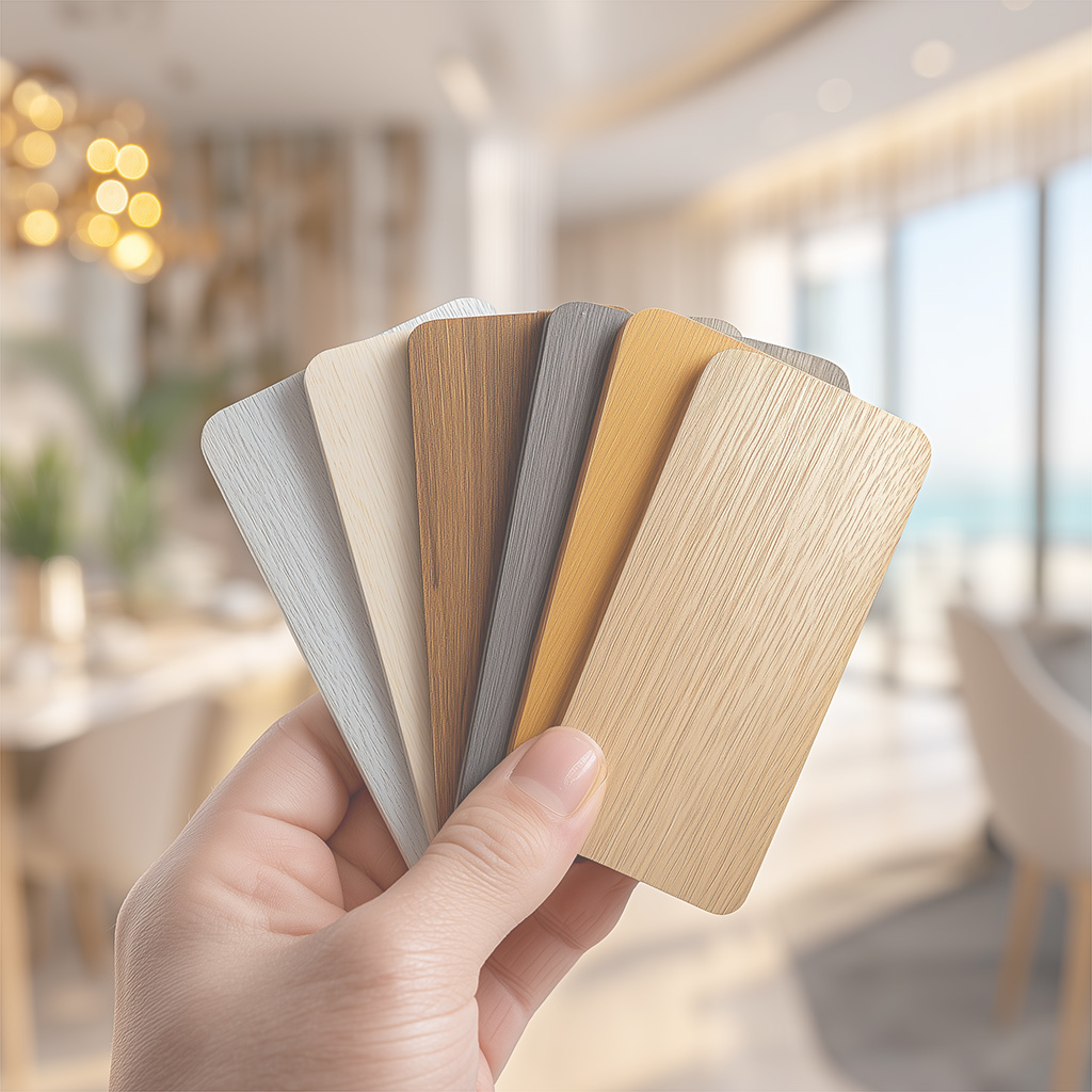 - teintes de bois, finitions mates ou satinées,