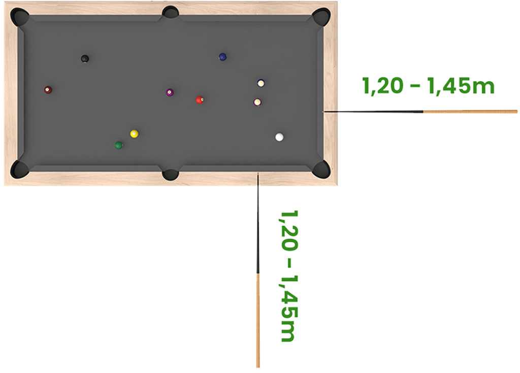 Ainsi, pour un billard de 2,10 m, il faut prévoir environ 4,70 m x 3,80 m d’espace total.