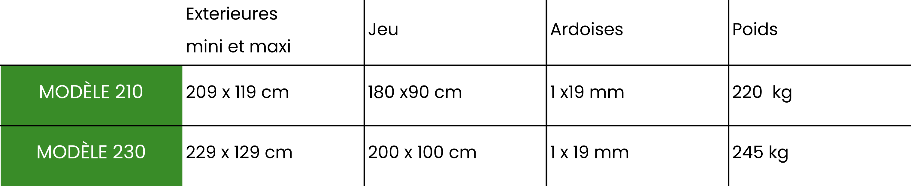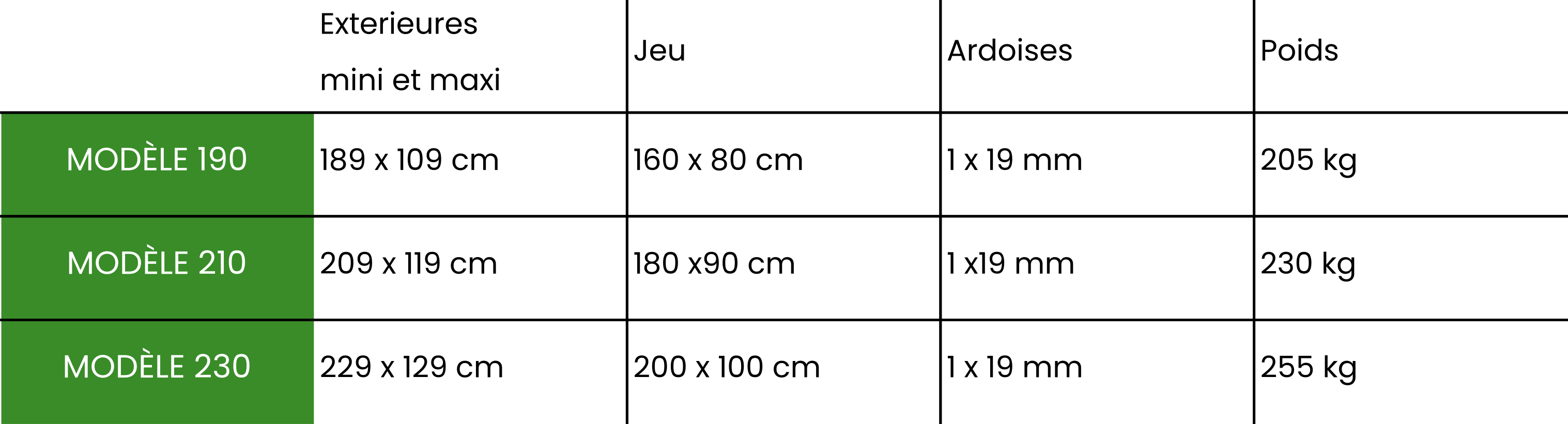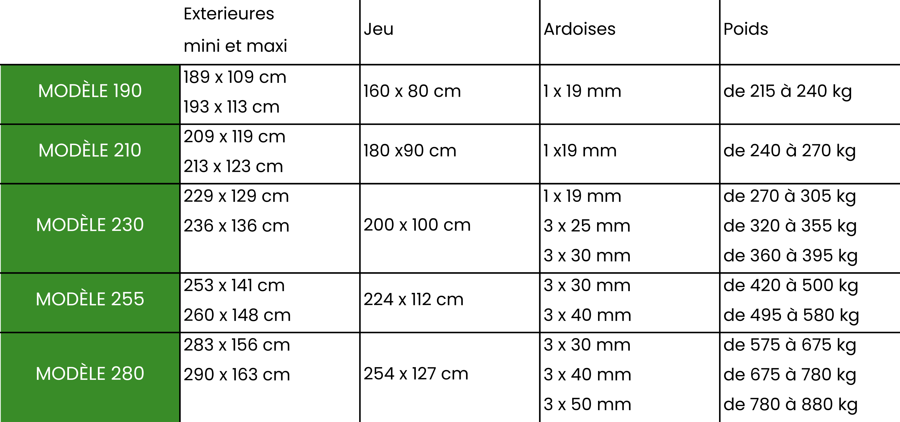 Bon à savoir : les poids peuvent varier selon les modèles, la finition, l'épaisseur de l'ardoise et les options choisies.