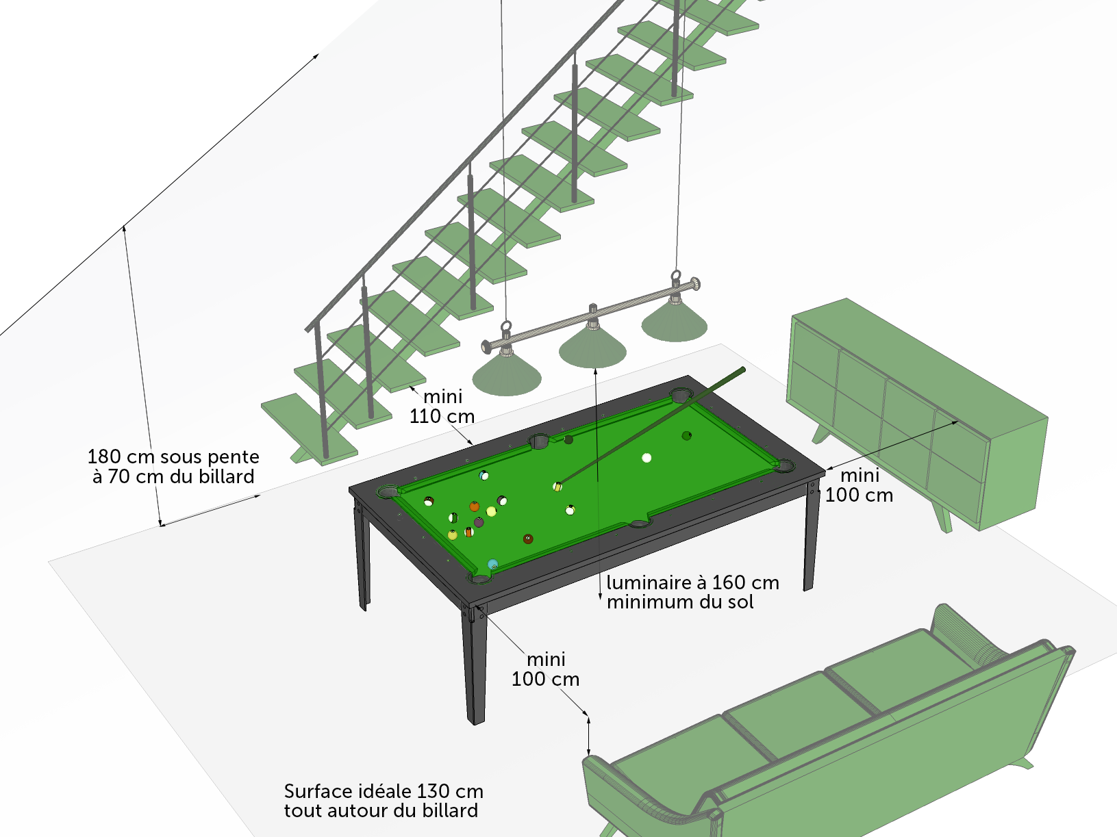 Pour que vos gestes soient libres, il faut donc prévoir environ 130 cm d’espace minimum entre le bord extérieur du billard et tout obstacle haut (mur, colonne, escalier, etc.).