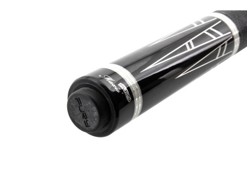 Dotée de la flèche STE (Speed Taper Evolution) caractérisée par son insert en matériau ultra léger sous la virole qui minimise la déflexion, la MS-1 Radial de Fury offre un excellent contrôle de chaque coup grâce — notamment — à son excellent pouvoir de pénétration et son ultime rapidité. La sensation de maîtrise du jeu est renforcée par la qualité de l'ouvrage façon filets de marqueterie en argent qui décorent le fût noir brillant. En effet, les motifs pointus qui dessinent les deux couronnes de part et d'autre du fût sont d'un tracé d'une telle finesse et doublés sur les transversales qu'ils évoquent avec justesse la vitesse et la puissance d'impact que promet cette queue de billard américain. Deux bagues couleur blanc ivoire incrustées chacune de deux fins colliers argentés entourent la bague centrale noire, le grip en lin d'Irlande noir et la dernière surmonte le talon qui laisse apparaître la signature argenté de la série Maxis.